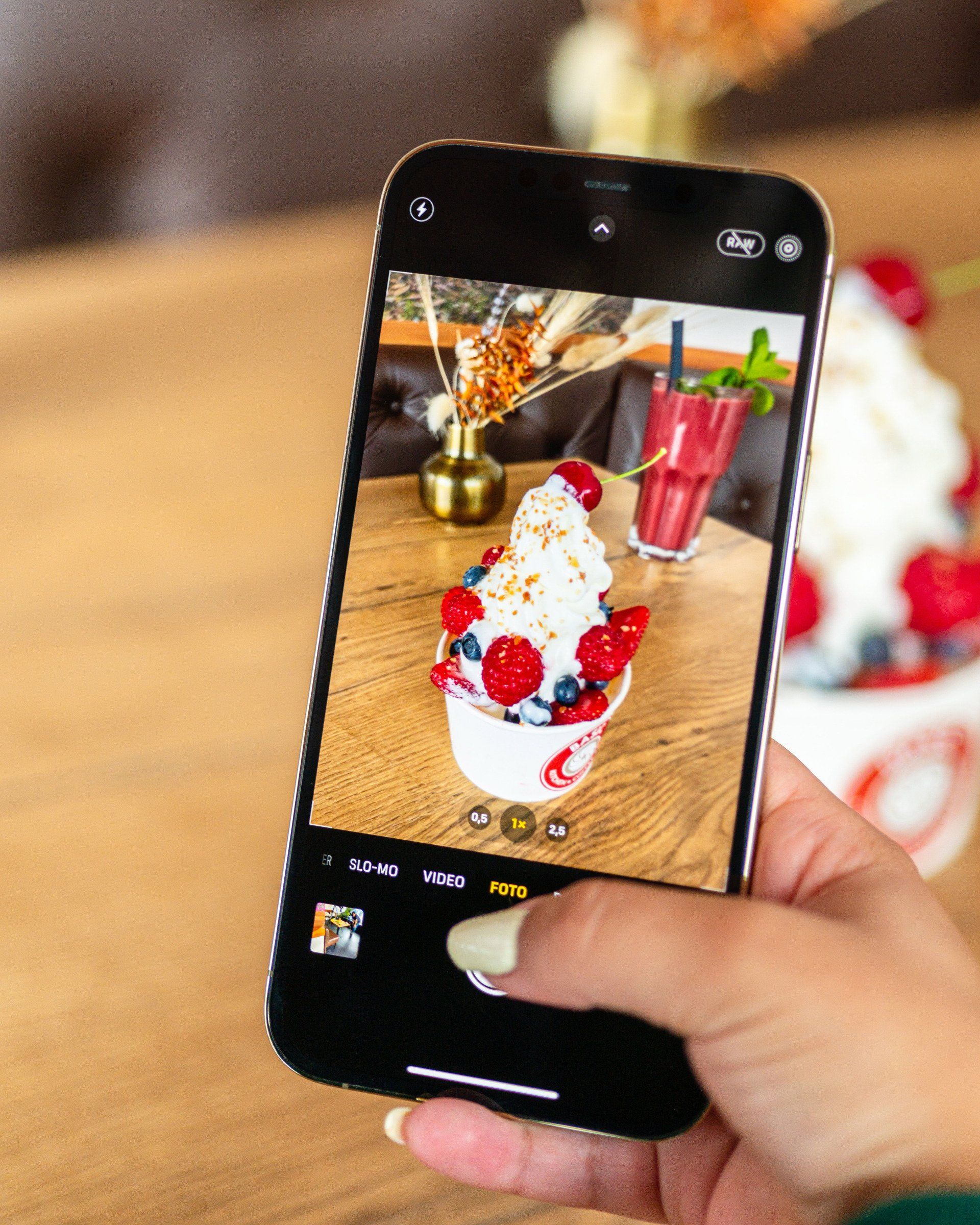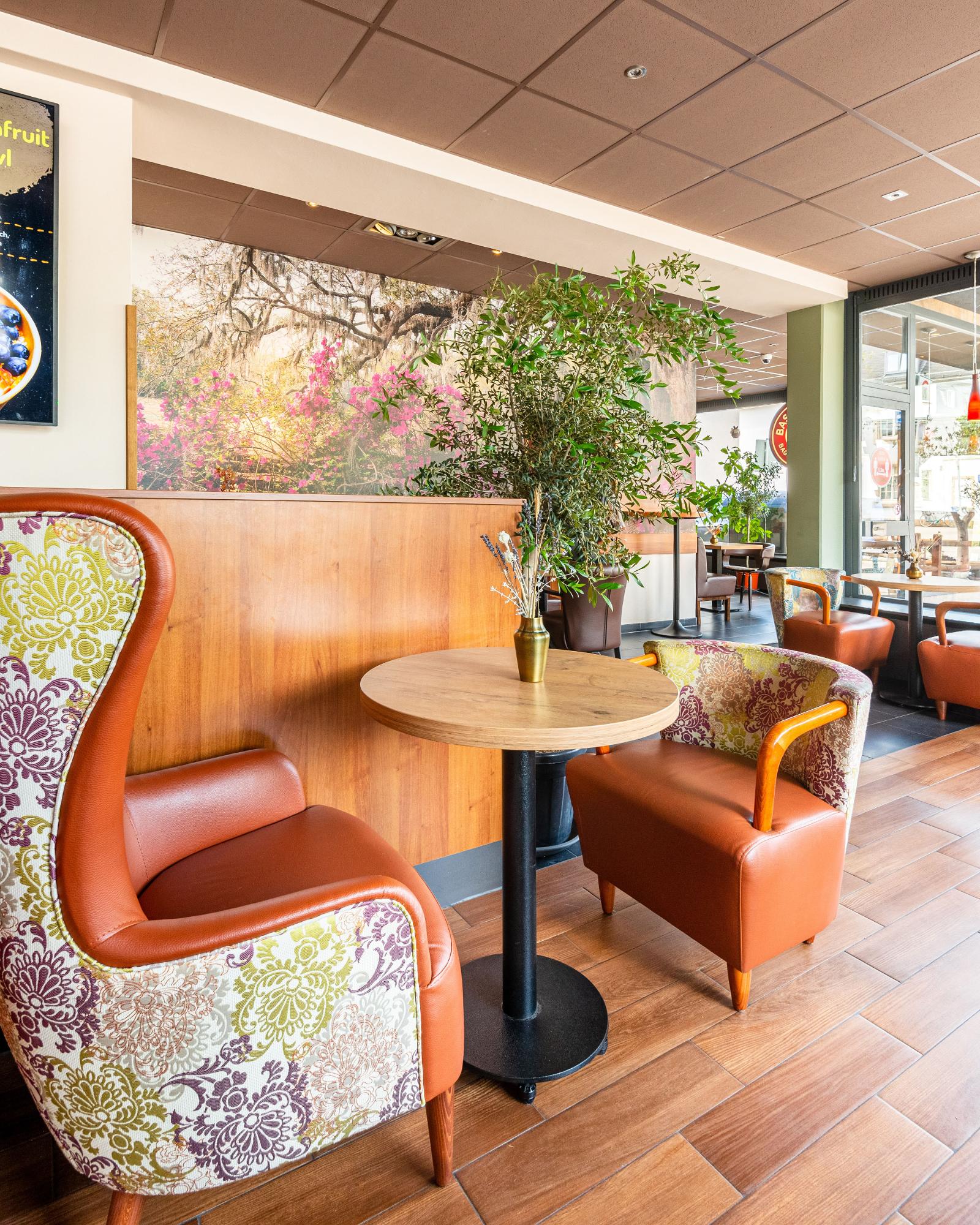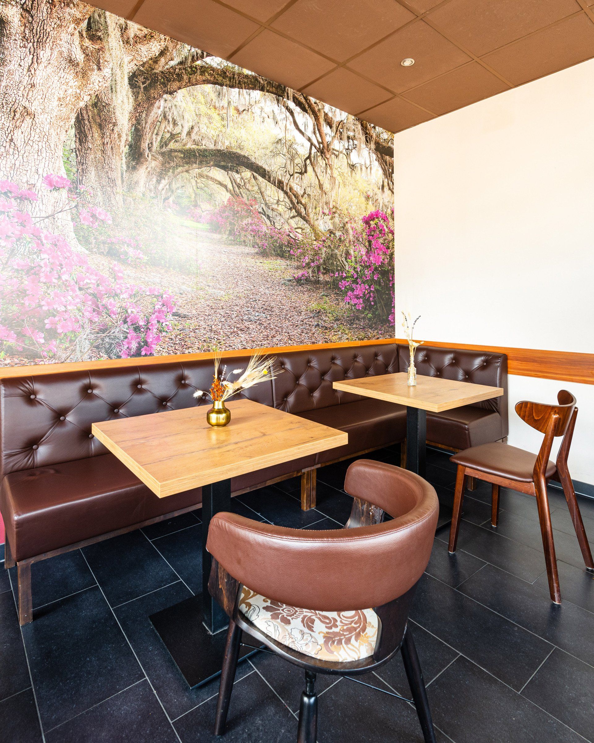 Auf knapp 80m2 mit 40 Sitzplätzen und Außenterrasse mit ca. 120 Sitzplätzen, erwartet dich ein gemütlicher Ort zur Entspannung, ausgestattet mit modernen Möbeln welche zum Verweilen und Genießen einladen.